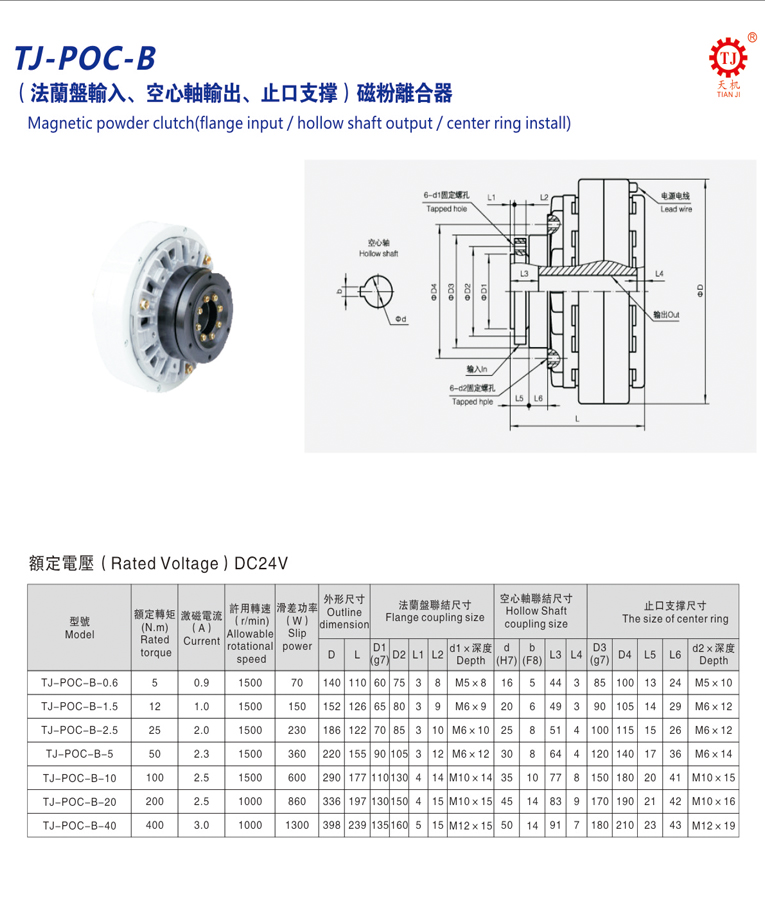 空心軸磁粉離合器(內(nèi)殼旋轉(zhuǎn)磁粉離合器)產(chǎn)品說(shuō)明:TJ-POC-B磁粉離合器的工作原理與TJ-POC磁粉離合器系列的工作原理是一樣的。TJ-POC-B系列空心軸輸出磁粉離合器采用圈靜止,雖然采用的是自然冷卻方式,由于在輸入旋轉(zhuǎn)端的外周部配置了散熱片及動(dòng)作面,自然冷卻效果好優(yōu)越性。它以磁粉為工作介質(zhì),以激磁電流為控制手段,達(dá)到控制制動(dòng)或傳遞轉(zhuǎn)鉅的目的。其輸出轉(zhuǎn)鉅與激磁電流呈良好的線性關(guān)系而與轉(zhuǎn)速或滑差無(wú)關(guān),并具有響應(yīng)速度快結(jié)構(gòu)簡(jiǎn)單等優(yōu)點(diǎn)。