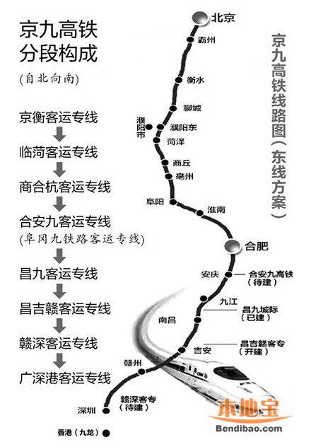 京九高鐵又稱京九客運(yùn)專線,線路全長2000公里,設(shè)計時速為350公里,北起北京,跨越京、冀、魯、豫、皖、贛、粵七個省級行政區(qū),南至深圳,連接香港九龍,是連接環(huán)渤海和珠三角的重要高速鐵路干線。途徑北京、霸州、任丘、河間、衡水、清河(邢臺)、臨清、聊城、臺前(濮陽)、梁山(濟(jì)寧)、菏澤、商丘、亳州、阜陽、淮南、合肥、安慶、九江、南昌、吉安、贛州、河源、惠州、深圳,最后到達(dá)香港九龍。主要由北京至衡水客專(京霸段預(yù)計2019年建成)、臨菏客專(臨清—菏澤)、商合杭高鐵(商丘到合肥段已經(jīng)建設(shè))、合安九客運(yùn)專線(阜陽到九江段),昌九客運(yùn)專線(九江—南昌)、昌贛客運(yùn)專線(南昌—贛州)和贛深客運(yùn)專線(贛州—深圳)和廣深港客運(yùn)專線(深圳—九龍)接駁而成。京九高鐵商丘以南段將先期建成通車,待北京到商丘段的規(guī)劃建設(shè)完成,京九高鐵將逐步形成。本專題將為您介紹2015京九高鐵最新消息和京九高鐵通車時間,幫助您了解最新資訊,方便你的出行。
