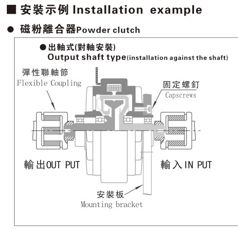 3、磁粉離合器的軸連接一定要使用彈性聯(lián)軸器,而且軸與軸之間的同心、直角度等必須保持在所使用的彈性聯(lián)軸器之容許值范圍內(nèi)。
