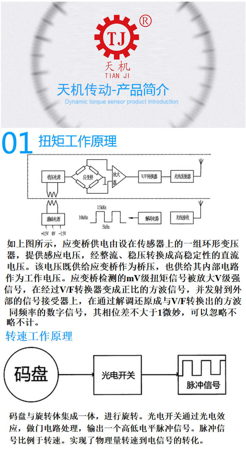 天機(jī)傳動(dòng)生產(chǎn)銷售的扭矩傳感器又稱動(dòng)態(tài)扭矩傳感器或非接觸扭矩傳感器,是采用應(yīng)變片電測(cè)技術(shù) ,在彈性軸上組成應(yīng)變橋,向應(yīng)變橋提供電源即可測(cè)得該彈性軸受扭的電信號(hào)。將該應(yīng)變信號(hào)放大后,經(jīng)過壓/頻轉(zhuǎn)換,變成與扭應(yīng)變成正比的頻率信號(hào)。該傳感器可以精確測(cè)量各種扭力、轉(zhuǎn)速及機(jī)械功率。扭矩傳感器,動(dòng)態(tài)扭矩傳感器,非接觸扭矩傳感器特點(diǎn):